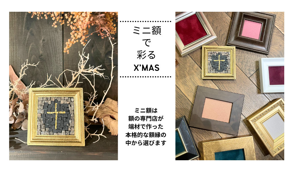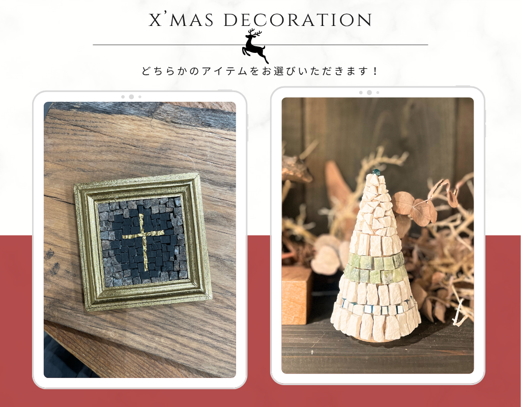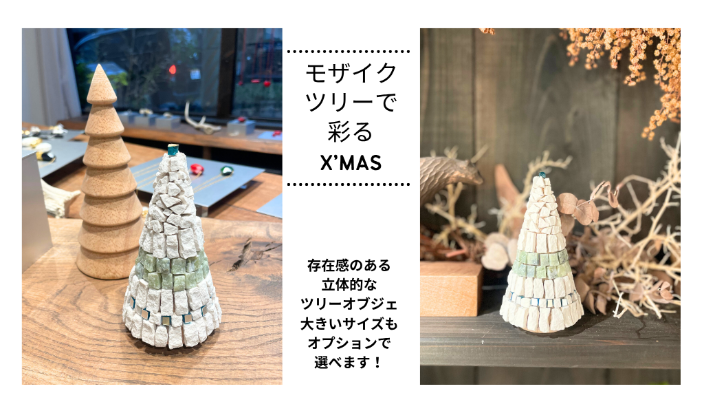 永遠の絵画と呼ばれるモザイク画。本格的な天然大理石を使ってモザイクアートを体験いただけます。毎年人気のワークショップ。今年は、クリスマスを彩るツリー型のオブジェか十字架をモチーフにしたミニ額飾りを作ります。モザイクの基礎を体験し、ゆっくりとお茶を飲みながらものづくりを楽しむ時間をお過ごしいただけます。