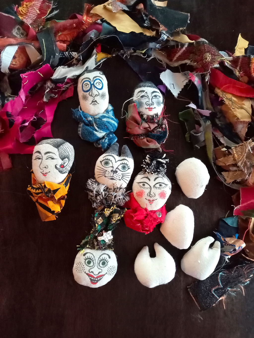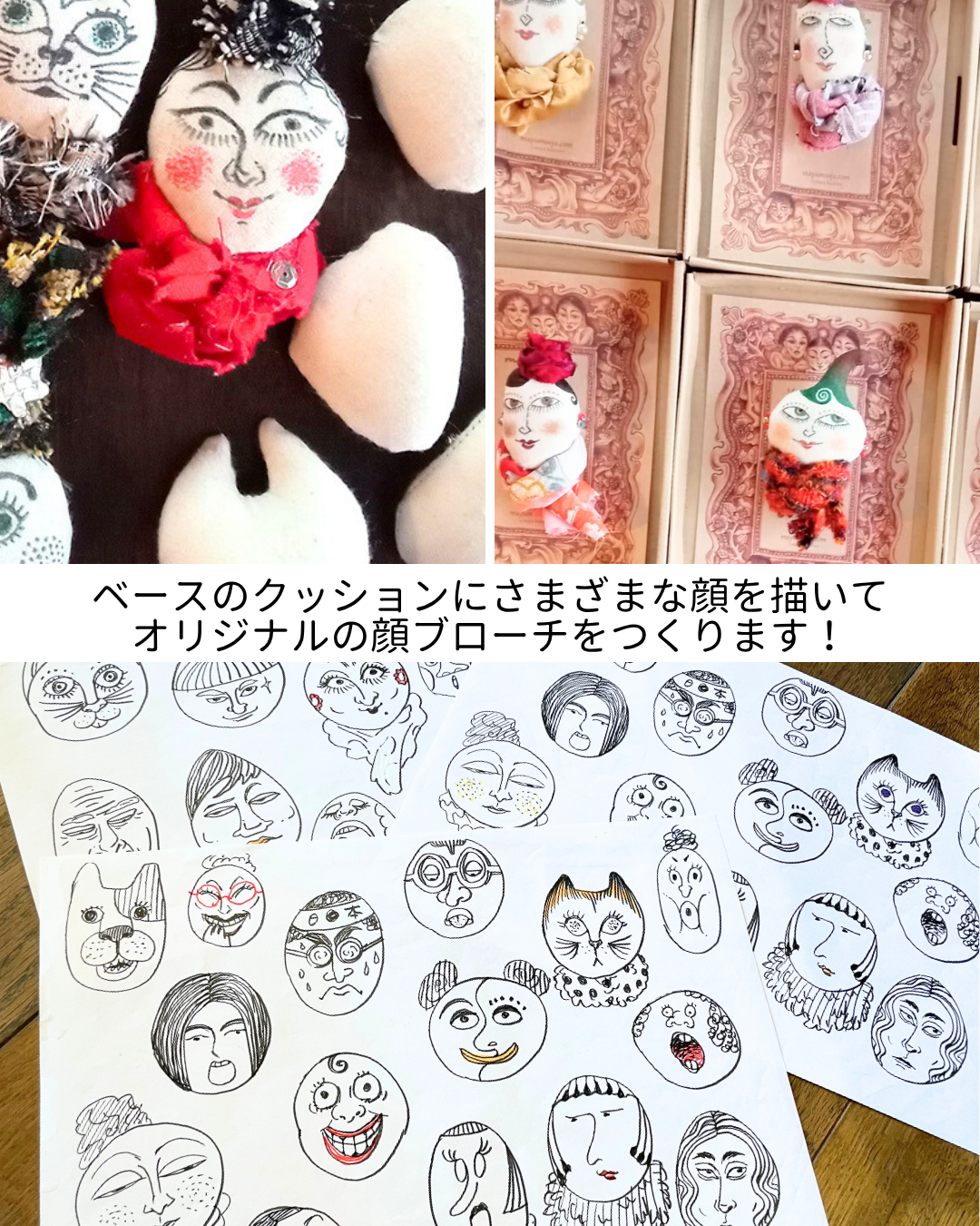 10月3日から始まる黒岩まゆの展示に合わせて現代美術家黒岩まゆのワークショップを開催します。黒岩まゆのマダムブローチやCATブローチ、DOGブローチと同じ布を使って、いろんな顔を描き、古布で装飾してしあげます。黒岩まゆ氏の作り出す独特の世界の一員に参加する顔ブローチを一緒につくりませんか。